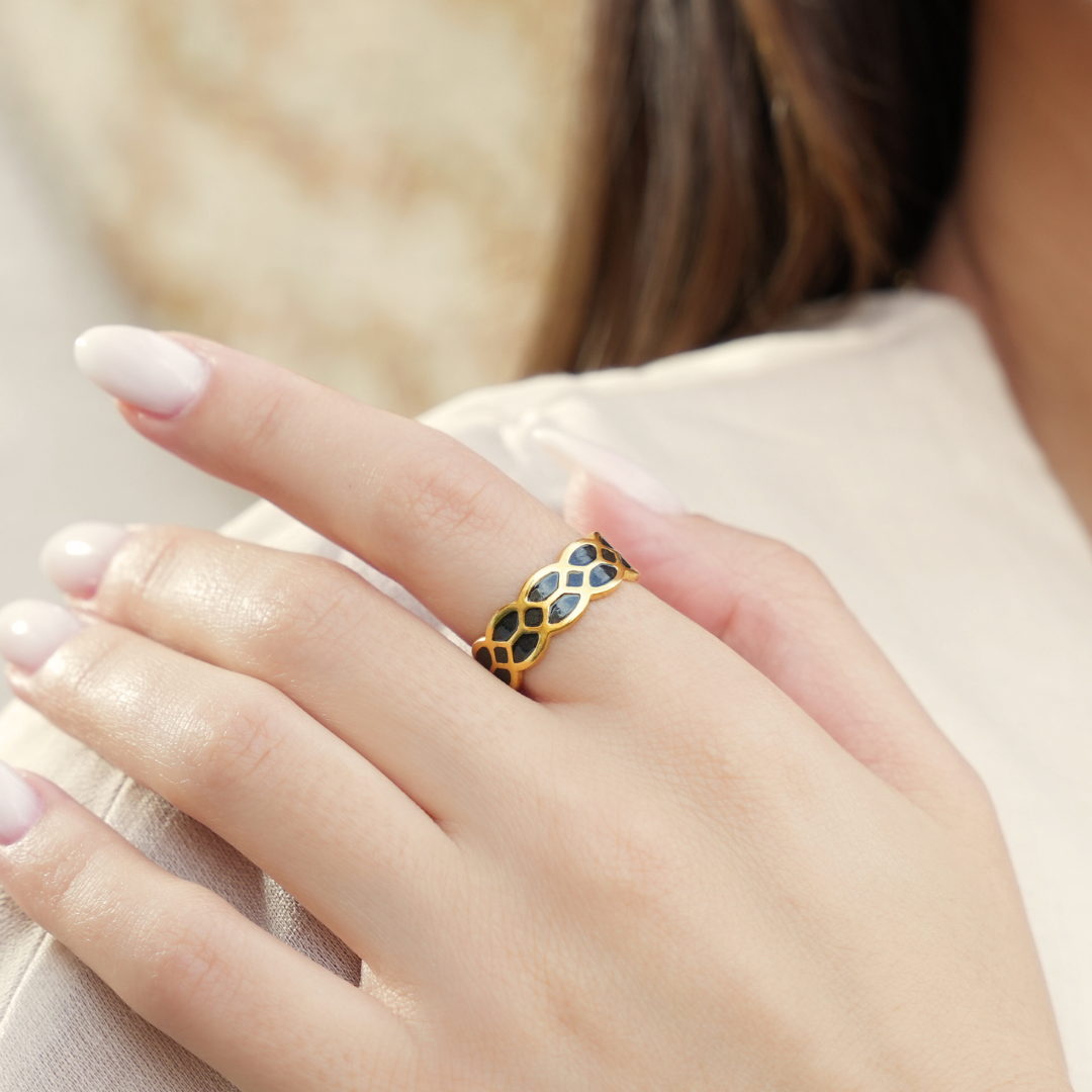 The repeating pattern reflects the rhythm found in Damascene designs, where order and continuity shape the form. Reimagined in a modern finish, it offers the look and spirit of the tradition in a wearable, everyday piece.