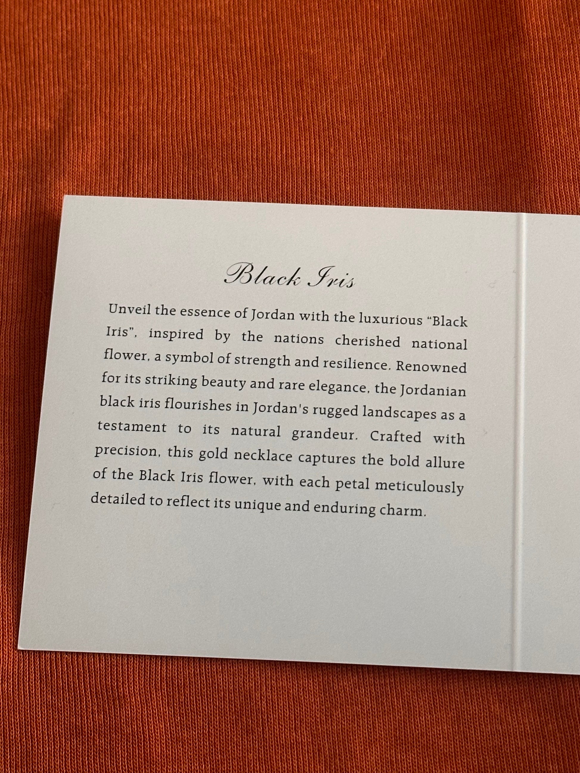 Unveil the essence of Jordan with the Black Iris Necklace, inspired by the nation’s cherished national flower — a symbol of strength, resilience, and rare beauty. Flourishing in Jordan’s rugged landscapes, the Black Iris stands as a testament to natural grandeur and cultural pride.