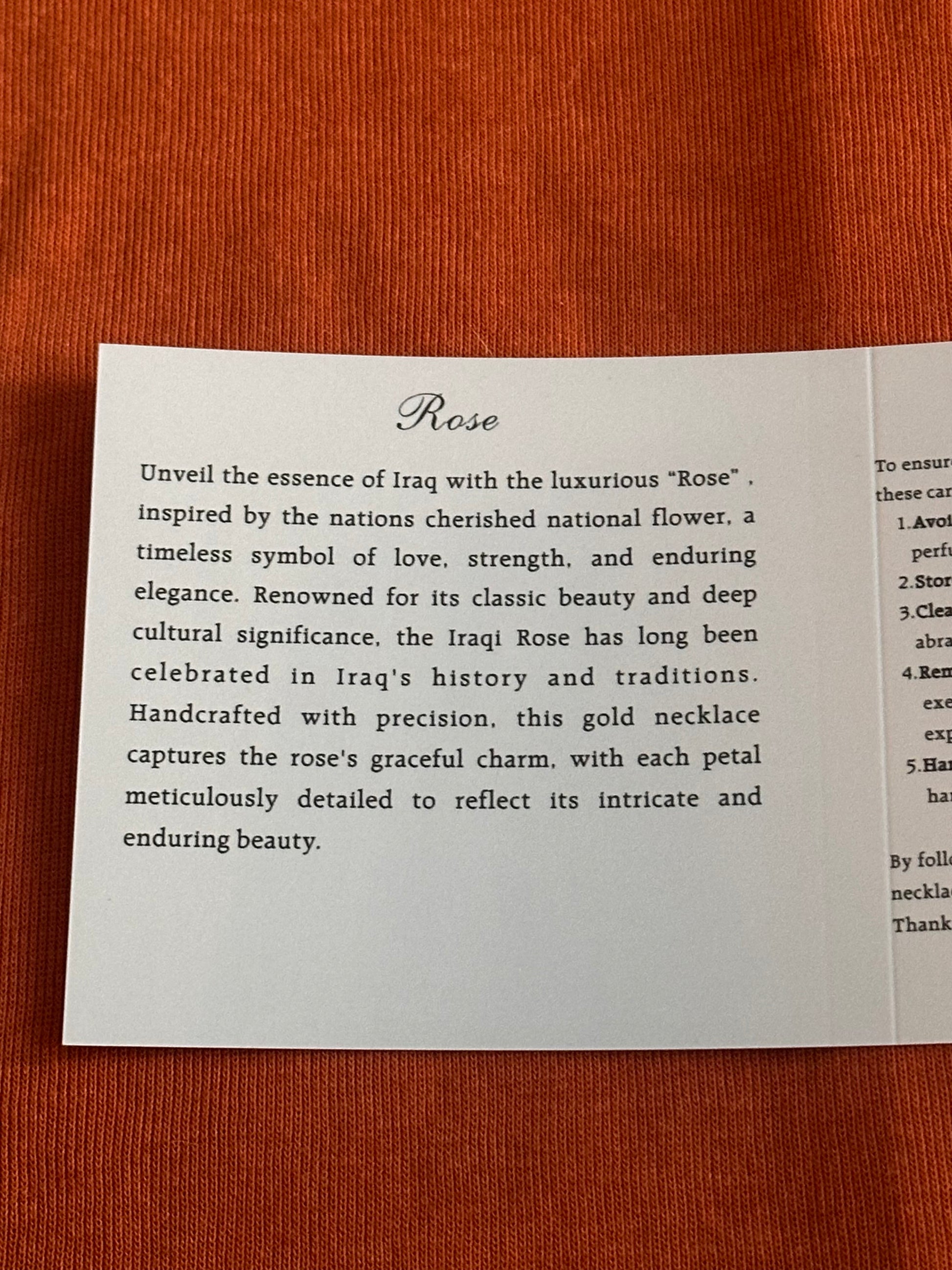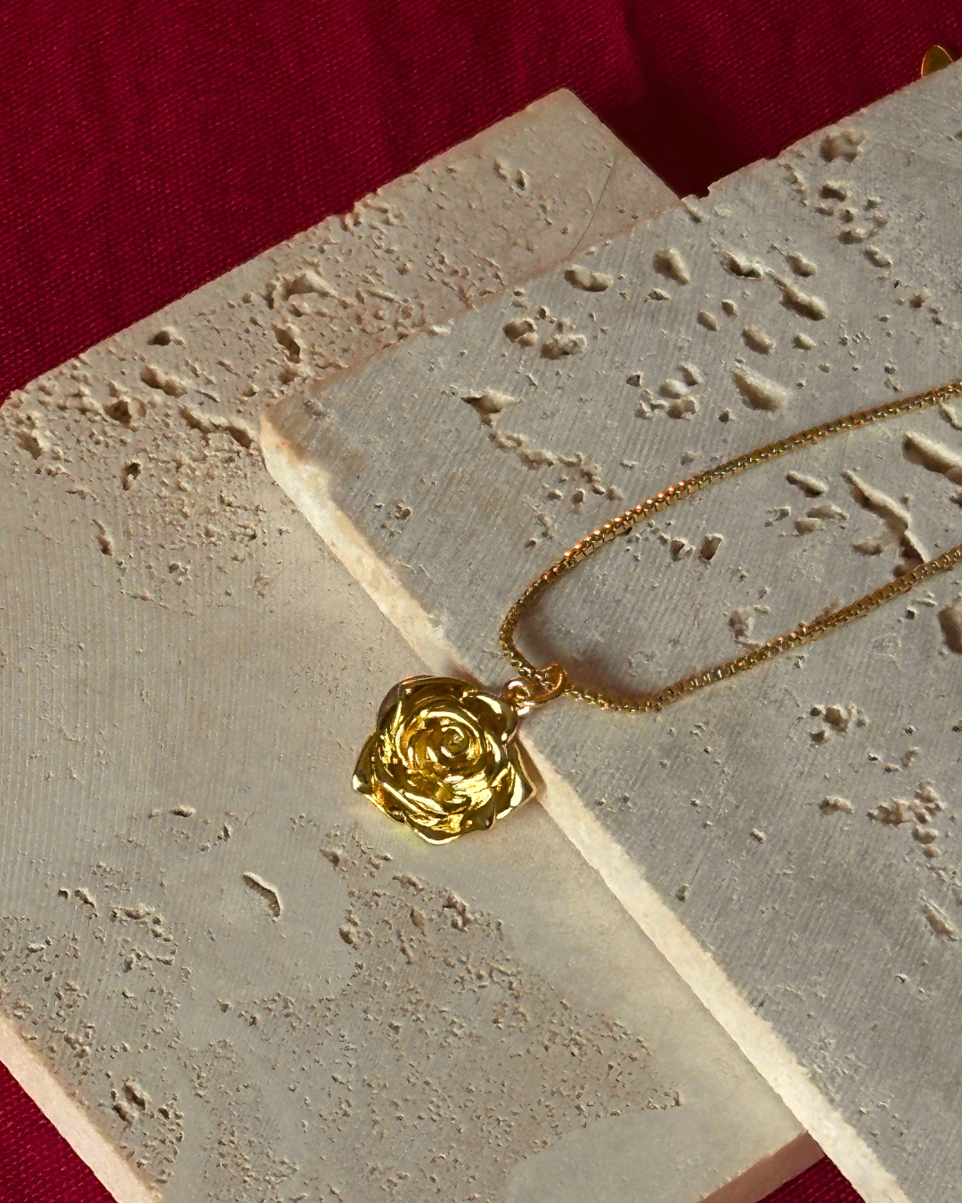 Unveil the essence of Iraq with the luxurious "Rose" inspired by the nations cherished national flower, a timeless symbol of love, strength, and enduring elegance. Renowned for its classic beauty and deep cultural significance, the Iraqi Rose has long been celebrated in Iraq's history and traditions. Handcrafted with precision, this gold necklace captures the rose's graceful charm, with each petal meticulously detailed to reflect its intricate and enduring beauty.