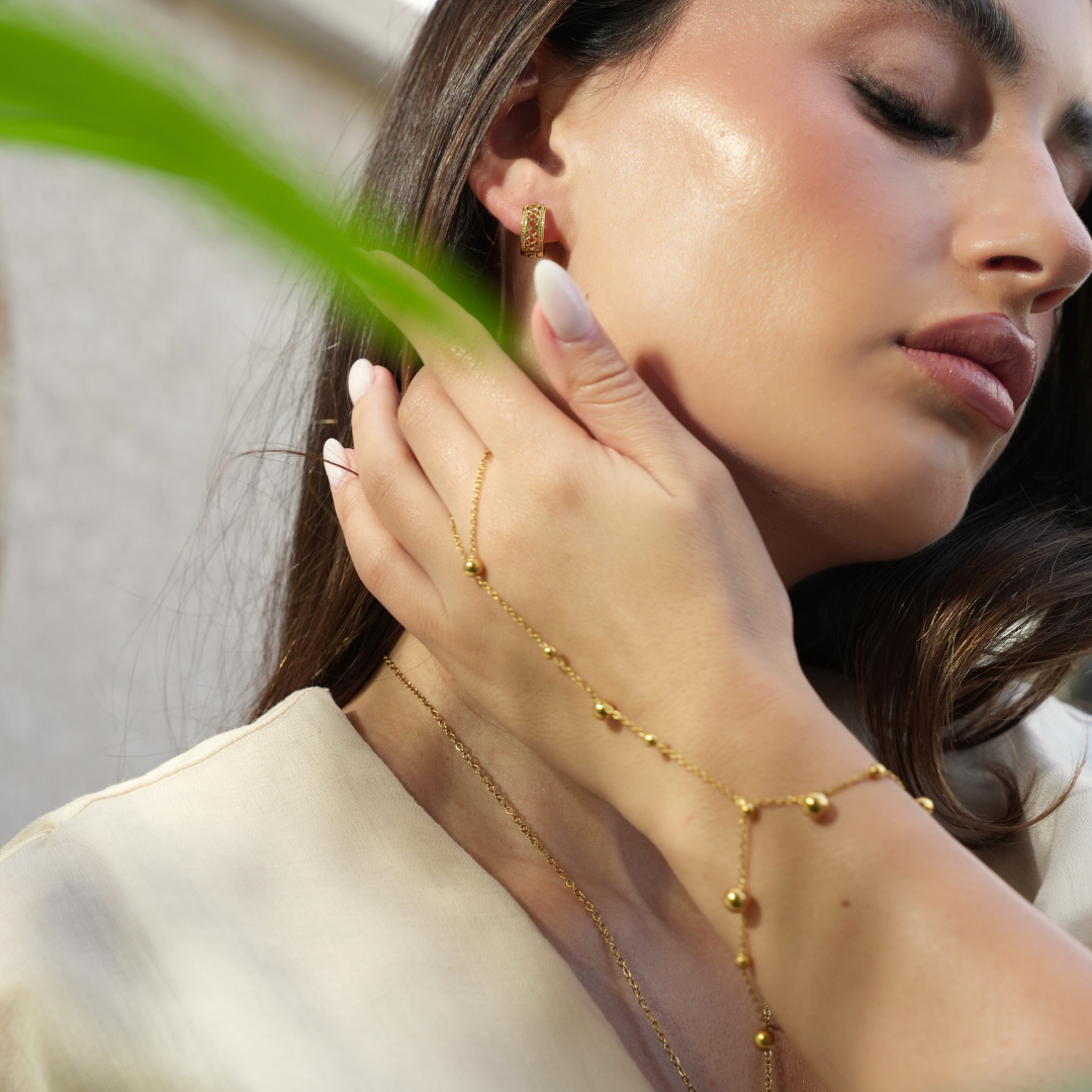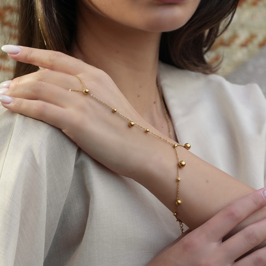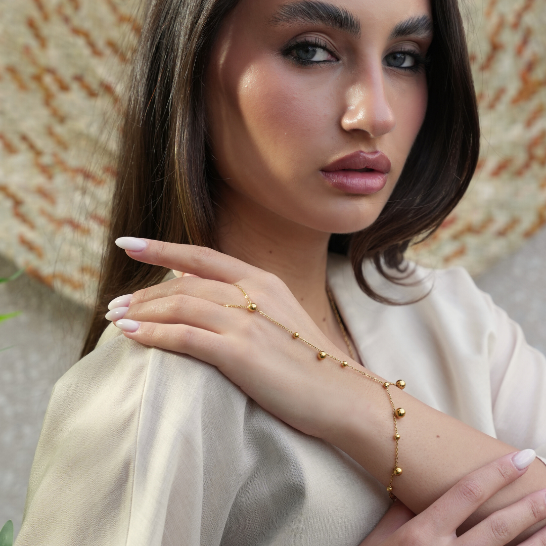 The gold-plated beads of Rihla echo this legacy. Crafted in varying sizes and spaced with intention, they form an elegant hand chain that moves fluidly with the body, reflecting rhythm, continuity, and quiet strength. This piece reimagines beads not as ornament, but as history in motion — worn as a reminder that to carry beads is to carry the world with you.
