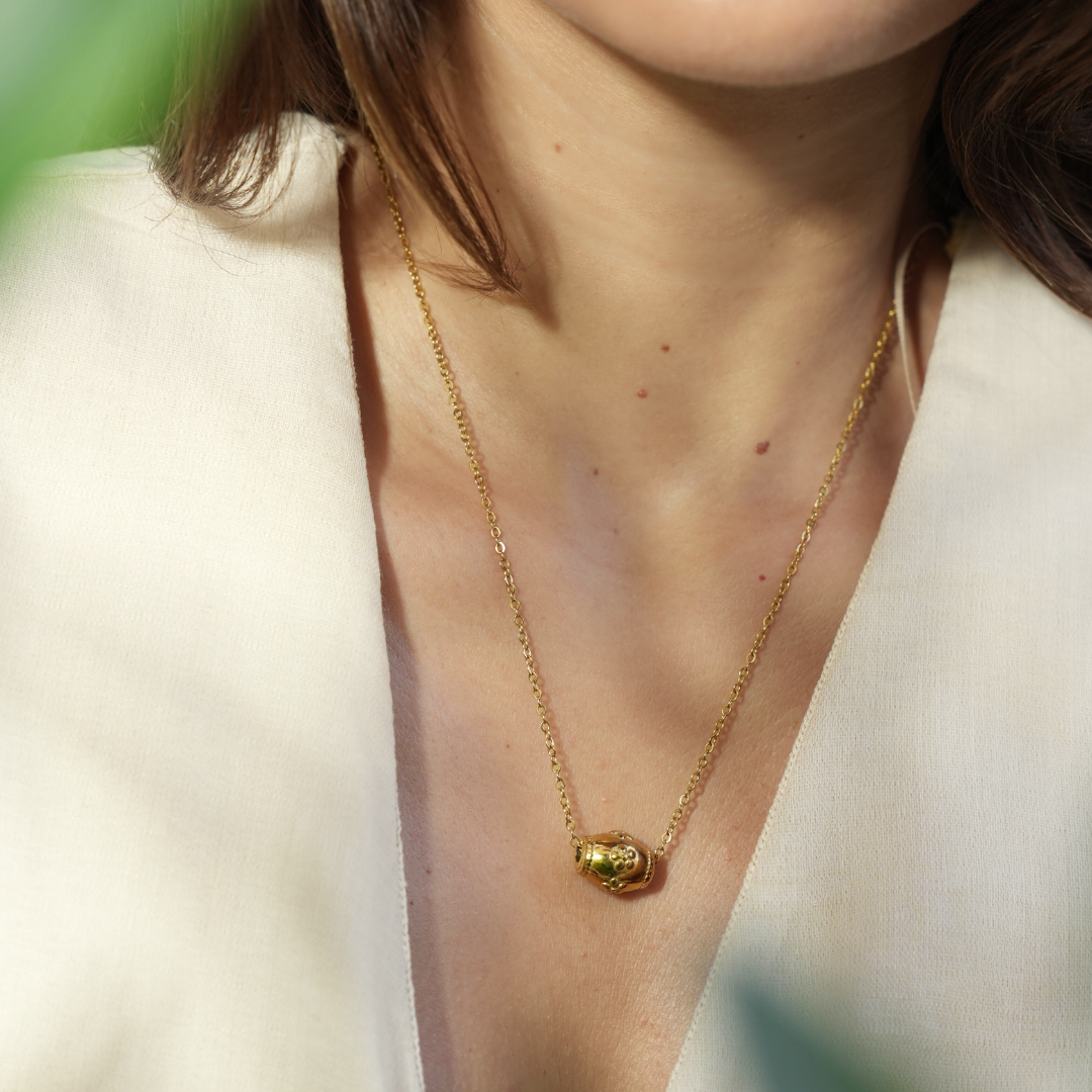 To keep your jewelry in the best condition, avoid contact with water, perfumes, and harsh chemicals. Store your piece in a dry place when not in use. Use the jewelry cloth provided to gently clean and maintain its shine. With proper care, your gold-plated stainless steel jewelry will stay beautiful for a long time.