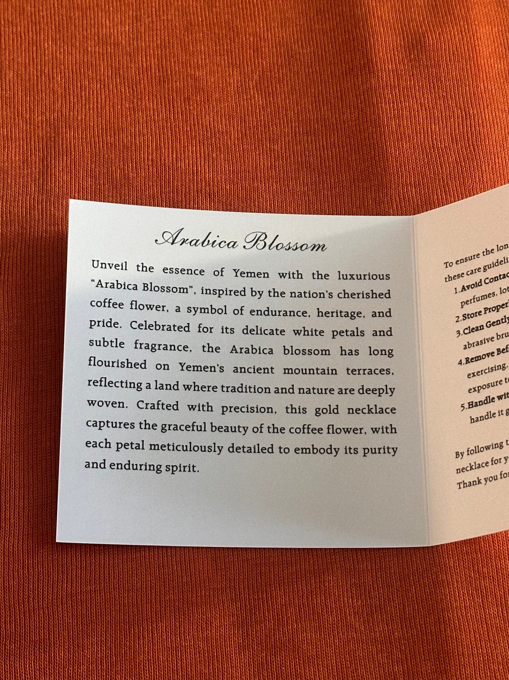 Unveil the essence of Yemen with the luxurious “Arabica Blossom”, inspired by the nation’s cherished national flower, a timeless symbol of beauty, resilience, and tradition. Celebrated for its delicate white petals and enchanting fragrance, the Arabica Blossom is deeply rooted in Yemeni culture, often associated with the country’s rich coffee heritage and enduring spirit.